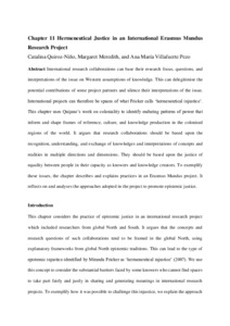 International research collaborations can base their research focus, questions and interpretations of the issue on Western assumptions of knowledge. This can delegitimise the potential contributions of some project partners and silence their interpretations of the issue. International projects can therefore be spaces of what Fricker calls ‘hermeneutical injustice’. This chapter uses Quijano’s work on coloniality to identify enduring patterns of power that inform and shape frames of reference, culture and knowledge production in the colonised regions of the world. It argues that research collaborations should be based upon the recognition, understanding, and exchange of knowledges and interpretations of concepts and realities in multiple directions and dimensions. They should be based upon the justice of equality between people in their capacity as knowers and knowledge creators. To exemplify these issues, the chapter describes and explains practices in an Erasmus Mundus project. It reflects on and analyses the approaches adopted in the project to promote epistemic justice.