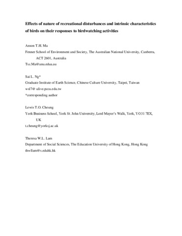 Effects of nature of recreational disturbances and intrinsic characteristics of birds on their responses to birdwatching activities.