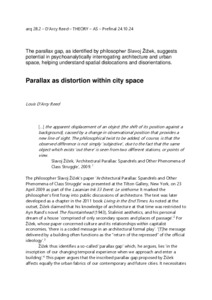 This paper explores the role of parallax in architecture and the so-called ‘parallax gap’ proposed by philosopher Slavoj Žižek in 2009. For Žižek the parallax gap is grounded in psychoanalytic short circuits, prompting a hypothesis about postmodern conflicts within architecture. While the concept of parallax has appeared within architecture at various points historically, Žižek’s parallax gap affords a possibility for the redirection of the viewer’s gaze away from the architectural object to the spaces inflected by, and between, neighbouring urban fabric. Reflecting on the potentialities of interrogating architecture and urban space psychoanalytically, I argue for an expansion of parallax focused on understanding spatial dislocations and disorientations. The result retraces parallax in urban space research, catering for a fertile investigation at the intersection of architecture, culture, politics, and psychoanalysis.
