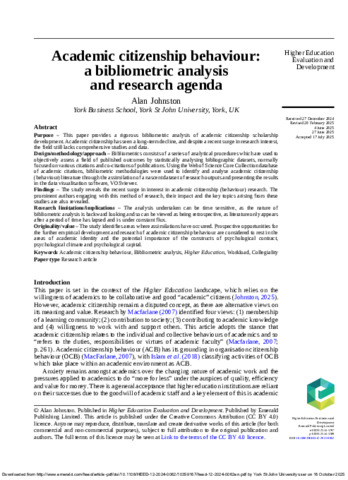 Design / methodology / approach - Bibliometrics consists of a series of analytical procedures which are used to objectively assess a field of published outcomes by statistically analysing of bibliographic datasets, normally focused on various citations and co-citations of publications. Using the Web of Science core collection database of academic citations, bibliometric methodologies were used to identify and analyse academic citizenship (behaviour) literature through the assimilation of a nascent dataset of research outputs and presenting the results the data visualisation software, VOSviewer.