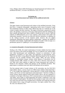 This paper situates sexual harassment and violence in the neoliberal university. Using data from a ‘composite ethnography’ representing twelve years of research, I argue that institutional inaction on these issues reflects how they are ‘reckoned up’ in the context of gender and other structures. The impact of disclosure is projected in market terms: this produces institutional airbrushing which protects both the institution and those (usually privileged men) whose welfare is bound up with its success. Staff and students are differentiated by power/value relations, which interact with gender and intersecting categories. Survivors are often left with few alternatives to speaking out in the ‘outrage economy’ of the corporate media: however, this can support institutional airbrushing and bolster punitive technologies. I propose the method of Grounded Action Inquiry, implemented with attention to Lorde’s work on anger, as a parrhesiastic practice of ‘speaking in’ to the neoliberal institution.