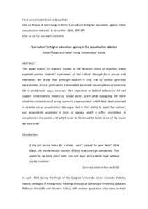 This paper reports on research funded by the National Union of Students, which explored women students’ experiences of ‘lad culture’ through focus groups and interviews. We found that although laddism is only one of various potential masculinities, for our participants it dominated social and sexual spheres of university life in problematic ways. However, their objections to laddish behaviours did not support contemporary models of ‘sexual panic’, even while oppugning the more simplistic celebrations of young women’s empowerment which have been observed in debates about sexualisation. We argue that in their ability to reject ‘lad culture’, our respondents expressed a form of agency which is often invisibilised in sexualisation discussions and which could be harnessed to tackle some of the issues we uncovered.