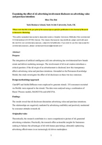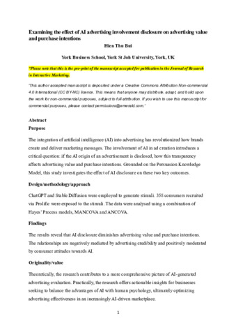 Examining the effect of AI advertising involvement disclosure on advertising value and purchase intentions.