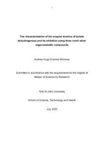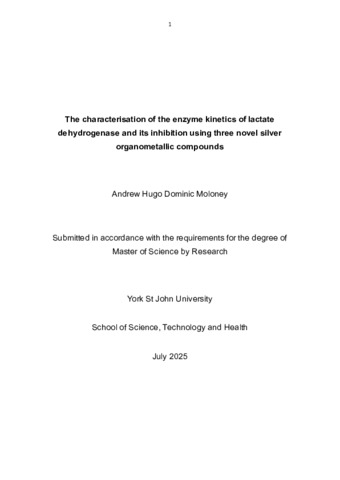 Moloney, Andrew Hugo Dominic (2025) The characterization of the enzyme kinetics of lactate dehydrogenase and its inhibition using three novel silver organometallic compounds. Masters thesis, York St John University.