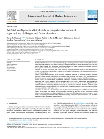 Analysis of relevant studies demonstrated substantial AI benefits: patient recruitment tools improved enrollment rates by 65%, predictive analytics models achieved 85% accuracy in forecasting trial outcomes, and AI integration accelerated trial timelines by 30–50% while reducing costs by up to 40%. Digital biomarkers enabled continuous monitoring with 90% sensitivity for adverse event detection. However, significant implementation barriers emerged, including data interoperability challenges, regulatory uncertainty, algorithmic bias concerns, and limited stakeholder trust.