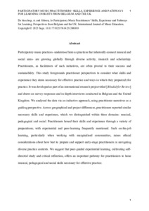 Participatory music practices—understood here as practices that inherently connect musical and social aims—are growing globally through diverse activity, research and scholarship. Practitioners, as facilitators of such initiatives, are often pivotal to their success and sustainability. This study foregrounds practitioner perspectives to consider what skills and experience they deem necessary for effective practice and ways in which they prepare(d) for practice. It was developed as part of an international research project titled Music for social impact: Practitioners’ contexts, work and beliefs and draws on survey responses and in-depth interviews conducted in Belgium and the United Kingdom. We analysed the data via an inductive approach, using practitioner narratives as a guiding perspective. Across geographical and project differences, practitioners reported similar necessary skills and experience, which we distinguished within three domains: musical, pedagogical and social. Practitioners honed their skills and experience through a variety of preparations; with experiential and peer-learning frequently mentioned. Such on-the-job learning, particularly when working with marginalised communities, raises ethical considerations about how best to prepare and support early-stage practitioners in navigating diverse practice contexts. We suggest that peer-guided experiential learning, cultivating self-directed study and critical reflection, offers an important pathway for practitioners to hone musical, pedagogical and social skills necessary for effective practice.