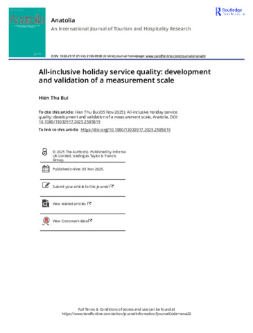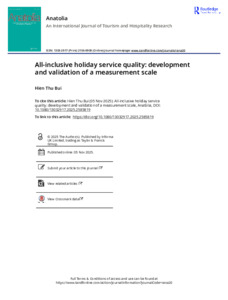 All-inclusive holiday service quality development and validation of a measurement scale.pdf - Published Version Available under License Creative Commons Attribution Non-commercial No Derivatives. | Preview |