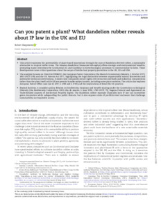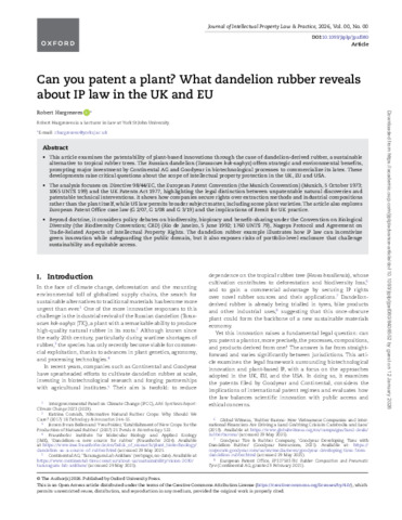 Beyond doctrine, it considers policy debates on biodiversity, biopiracy and benefit-sharing under the Convention on Biological Diversity (the Biodiversity Convention; CBD) (Rio de Janeiro, 5 June 1992; 1760 UNTS 79), Nagoya Protocol and Agreement on Trade-Related Aspects of Intellectual Property Rights. The dandelion rubber example illustrates how IP law can incentivize green innovation while safeguarding the public domain, but it also exposes risks of portfolio-level enclosure that challenge sustainability and equitable access.