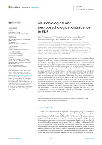 Westerman, Matt, Kafkas, Alex, Parry-Jones, Adrian, Strong, Samantha, Retzler, Chris and Hallam, Glyn (2025) Neurobiological and neuropsychological disturbance in EDS. Frontiers in Neurology, 16. p. 1648702.