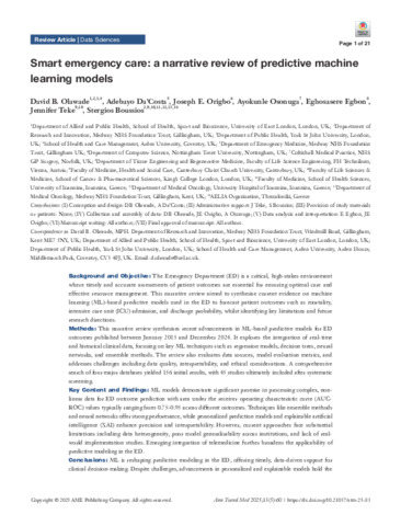 Background and objectiveThe Emergency Department (ED) is a critical, high-stakes environment where timely and accurate assessments of patient outcomes are essential for ensuring optimal care and effective resource management. This narrative review aimed to synthesise current evidence on machine learning (ML)-based predictive models used in the ED to forecast patient outcomes such as mortality, intensive care unit (ICU) admission, and discharge probability, whilst identifying key limitations and future research directions.MethodsThis narrative review synthesises recent advancements in ML-based predictive models for ED outcomes published between January 2015 and December 2024. It explores the integration of real-time and historical clinical data, focusing on key ML techniques such as regression models, decision trees, neural networks, and ensemble methods. The review also evaluates data sources, model evaluation metrics, and addresses challenges including data quality, interpretability, and ethical considerations. A comprehensive search of four major databases yielded 156 initial results, with 45 studies ultimately included after systematic screening.Key content and findingsML models demonstrate significant promise in processing complex, non-linear data for ED outcome prediction with area under the receiver operating characteristic curve (AUC-ROC) values typically ranging from 0.75-0.95 across different outcomes. Techniques like ensemble methods and neural networks offer strong performance, while personalized prediction models and explainable artificial intelligence (XAI) enhance precision and interpretability. However, current approaches face substantial limitations including data heterogeneity, poor model generalisability across institutions, and lack of real-world implementation studies. Emerging integration of telemedicine further broadens the applicability of predictive modeling in the ED.ConclusionsML is reshaping predictive modeling in the ED, offering timely, data-driven support for clinical decision-making. Despite challenges, advancements in personalized and explainable models hold the potential to increase trust and usability in clinical workflows. Critical gaps remain in addressing data quality issues, standardising evaluation metrics, and conducting multi-centre validation studies.