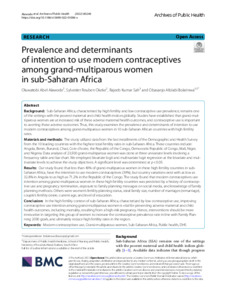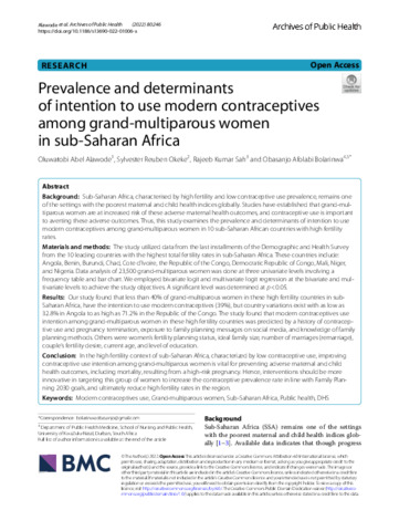 Prevalence and determinants of intention to use modern contraceptives among grand‑multiparous women in sub‑Saharan Africa.