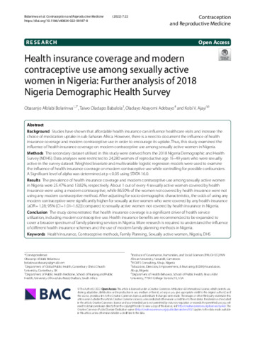 Health insurance coverage and modern contraceptive use among sexually active women in Nigeria: Further analysis of 2018 Nigeria Demographic Health Survey.