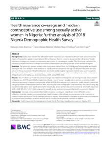 Studies have shown that affordable health insurance can influence healthcare visits and increase the choice of medication uptake in sub-Saharan Africa. However, there is a need to document the influence of health insurance coverage and modern contraceptive use in order to encourage its uptake. Thus, this study examined the influence of health insurance coverage on modern contraceptive use among sexually active women in Nigeria.