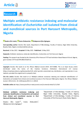 Multiple antibiotic resistance indexing and molecular identification of Escherichia coli isolated from clinical and nonclinical sources in Port Harcourt Metropolis, Nigeria.