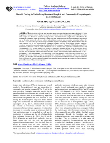 Escherichia coli is the most prevalent organism responsible for urinary tract infections (UTIs) in hospital and community sources. The present study was carried out to detect multi drug resistant (MDR) E coli from urine samples and the role of plasmids in drug resistance. One hundred urine samples were collected from the hospital and community within the University of Port Harcourt. Microscopic and chemical examination was carried out on the urine samples. E coli were isolated and antibiotic sensitivity test was carried out on the isolates, the resistant E. coli were cured by acridine orange and further subjected susceptibility testing. Result obtained from the study showed 35% E. coli recovered from community samples and 65% from hospital samples. Antibiotic sensitivity testing before plasmid curing showed high level of resistance to Augmentin (99%), Cefuroxime (92%), Ceftazidime (78%) and Cefixime (71%). The lowest level of resistance was reported in Gentamicin (15%) and Nitrofurantoin (19%). All the isolates were resistant to Augmentin but upon plasmid curing the resistant rate of