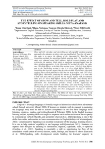 Oktaviani, Enma, Ilham, Ilham, Lukman, Lukman, Olatunji, Samson Olusola and Whitworth, Nicole (2024) The effect of show and tell, role-play and storytelling on speaking skills: Meta-analysis. JOLLT Journal of Languages and Language Teaching, 12 (2). pp. 846-858.
