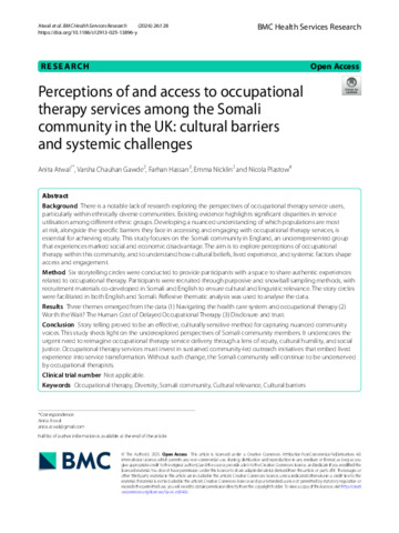 Atwal, Anita, Gawde, Varsha Chauhan, Hassan, Farhan, Nicklin, Emma and Plastow, Nicola (2025) Perceptions of and access to occupational therapy services among the Somali community in the UK: cultural barriers and systemic challenges. BMC health services research, 26 (128).