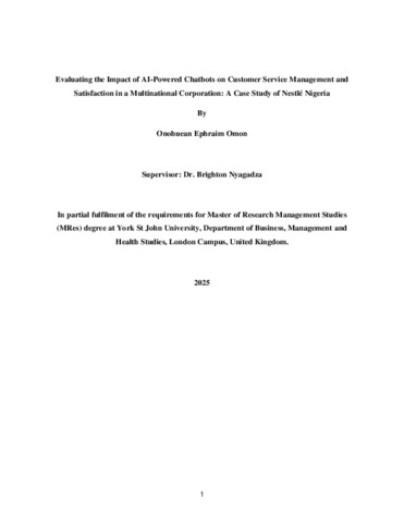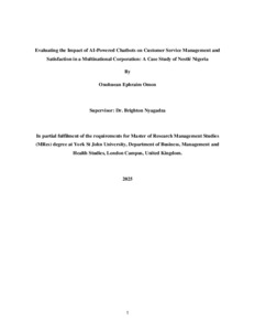 Onohuean, Ephraim (2025) Evaluating the Impact of AI-Powered Chatbots on Customer Service Management and Satisfaction in a Multinational Corporation: A Case Study of Nestlé Nigeria. Masters thesis, York St John University.