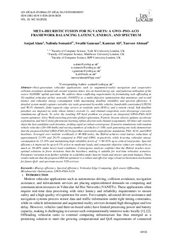 Alam, Amjad, Somasiri, Nalinda ORCID logoORCID: https://orcid.org/0000-0001-6311-2251, Ganesan, Swathi ORCID logoORCID: https://orcid.org/0000-0002-6278-2090 and Ali, kamran (2025) Meta-Heuristic Fusion for 5G VANETs: A GWO–PSO–ACO Framework Balancing. Latency, Energy and Spectrum. Lex localis - Journal of Local Self-Government, 23 (56). pp. 6918-6947.
