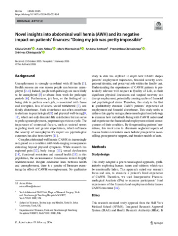 Complex abdominal wall hernia (CAWH) is increasingly recognised as a condition with wide-ranging consequences extending beyond physical symptoms. While research has explored pain [12], body image [13], sexual dysfunction [14], functional restriction and mental health [15] in this population, the socioeconomic dimensions remain largely underexamined. Despite evidenced links between health and unemployment, there is a paucity of literature examining the effect of CAWH on employment. No qualitative study to date has explored in depth how CAWH shapes patients’ employment trajectories, financial security, occupational identity, and perceived role within the family unit. Understanding the experiences of CAWH patients is particularly relevant with respect to Quality of Life, as their significant physical limitations and surgical recovery can disrupt employment, potentially creating cycles of financial and psychological strain. Therefore, this study is the first to qualitatively examine CAWH patients’ experience of employment and financial disturbance. This study seeks to address this gap by using a phenomenological methodology to examine how individuals living with CAWH understand and experience the financial and employment-related consequences of their condition. By foregrounding patients’ narratives, this work aims to illuminate neglected aspects of disease burden and inform more holistic preoperative counselling, postoperative support, and broader models of care.