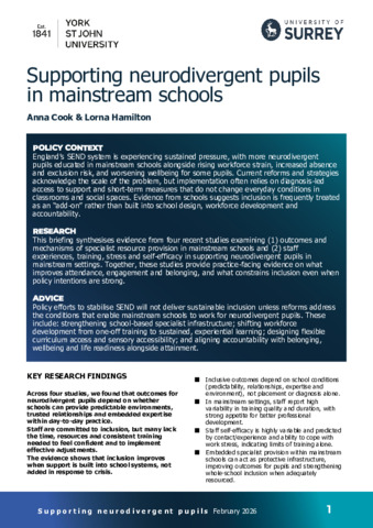 Cook & Hamilton (2026). Policy briefing - Supporting neurodivergent pupils in mainstream schools.pdf - Published Version | Preview |