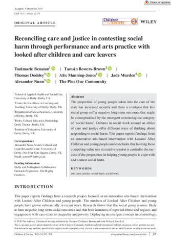 Children Society - 2020 - Benaton - Reconciling care and justice in contesting social harm through performance and arts.pdf - Published Version Available under License Creative Commons Attribution Non-commercial No Derivatives. | Preview |