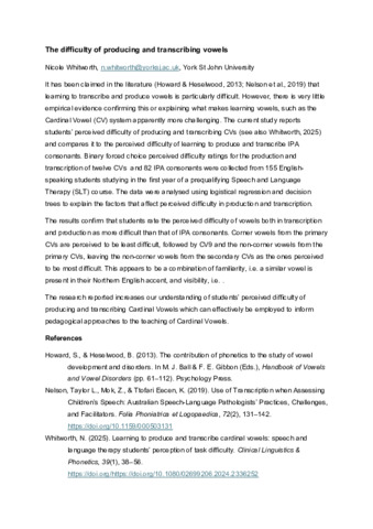 Whitworth, Nicole (2026) The difficulty of producing and transcribing vowels. In: Colloquium of the British Association of Academic Phoneticians 2026, 8 -10 April 2026, Warwick University. (Unpublished)