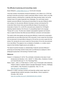 The results confirm that students rate the perceived difficulty of vowels both in transcription and production as more difficult than that of IPA consonants. Corner vowels from the primary CVs are perceived to be least difficult, followed by CV9 and the non-corner vowels from the primary CVs, leaving the non-corner vowels from the secondary CVs as the ones perceived to be most difficult. This appears to be a combination of familiarity, i.e. a similar vowel is present in their Northern English accent, and visibility, i.e. .