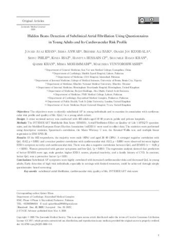 Khan, Junaid Ayaz, Anwar, Sidra, Baig, Beenish Ali, Iguodale, Osagie Joy, Philip, Shinu, Riaz, Kinza, Hussain CP, Haniyya, Khan, Shaumile Hasan, Khan, Qaiser, Mohammadi, Misha and Vunyorohwashe, Makurira (2026) Hidden Beats: Detection of Subclinical Atrial Fibrillation Using Questionnaires in Young Adults and Its Cardiovascular Risk Profile. Juntendo Medical Journal.