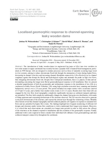 The introduction of leaky wooden dams (or engineered log jams or LDs) into river corridors in low-order steams in upper catchments has recently become a popular form of natural flood management, particularly in NW Europe. LDs are designed to emulate processes such as those of naturally occurring large wood in river systems, aiming to reduce downstream flood risk through the attenuation of water during higher flows, decreasing in-channel velocities and increasing channel–floodplain connectivity. LDs effectively act as channel roughness agents that disrupt the fluvial and hydrological regime and attenuate the peaks in high river flows, thus mitigating downstream flood risk. Despite their widespread installation, there is a paucity of data and understanding concerning the longer-term fluvial geomorphological response to LD installation. Here we present a detailed quantification of both the geomorphic and sedimentary response to the installation of two LDs in a catchment in Dalby Forest (North Yorkshire, UK) using high-resolution terrestrial laser scanning and detailed bathymetric surveys over a 2.5-year period. This period included two major storms with a recurrence interval of 3.9 and 3.4 years, and a further four smaller storm events (1.22–2.3 years). Results show that when LDs are engaged by the river flow, local topographic complexity significantly increases as sediment transport pathways are perturbed. The flow field complexity additionally changes the channel bed grain-size distribution, with trends of fining upstream and coarsening downstream of the structure observed. The LD was also observed to generate scour pools downstream of the structure, and coarsen the armour layer through the winnowing of fines. Monthly observations reveal that channel topography and bed sediment patterns self-organise in response to sustained low flows and are perturbed by higher flow events. The findings highlight how frequent monitoring of different LD designs and structures under various flow conditions is vital to understand their longer-term impacts. Moreover, it is critical that such observations are extended over longer-term periods in order to fully assess the efficacy of the structures as the channels respond to installations and the evolution of the geomorphic response. Finally, additional work is also required to better consider how individual LDs influence local geomorphology and alter sediment transport connectivity throughout the catchment.