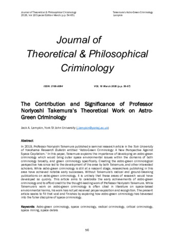 In 2019, Professor Noriyoshi Takemura published a seminal research article in the Toin University of Yokohama Research Bulletin entitled “Astro-Green Criminology: A New Perspective Against Space Capitalism.” In this paper, Takemura explains the importance of developing an astro-green criminology which would bring outer space environmental issues within the domains of both criminology broadly, and green criminology specifically. Creating the astro-green criminological perspective has since led to the development of the area by both Takemura, and other interested scholars. While astro-green criminology is still at a nascent stage, researchers publishing in this area have achieved notable early successes. Without Takemura’s radical and ground-breaking publications on astro-green criminology, it is unlikely that these areas of research would have developed so quickly. This article aims to celebrate the early achievements of astro-green criminology and to afford credit to the thought-leading work of Professor Noriyoshi Takemura. While Takemura’s work on astro-green criminology is often cited in literature on space-based environmental harms, his work has not yet received proper exposition and recognition. The present article seeks to fill that void and finishes by exploring how astro-green criminology has traversed into the fuller discipline of space criminology.