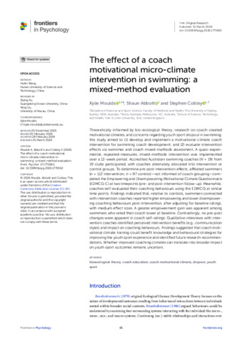 Moulds, Kylie, Abbott, Shaun and Cobley, Stephen (2026) The effect of a coach motivational micro-climate intervention in swimming: a mixed-method evaluation. Frontiers in Psychology, 17. p. 1771962.