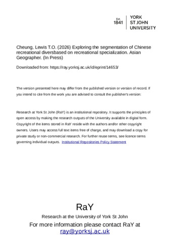 Exploring the segmentation of Chinese recreational divers based on recreational specialization.pdf - Published Version Available under License Creative Commons Attribution Non-commercial No Derivatives. | Preview |