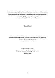 Bahrami, Mitra (2026) On-campus supervised physical activity programme for university students facing mental health challenges – a feasibility study exploring feasibility, acceptability, fidelity and preliminary effects. Masters thesis, York St John University.