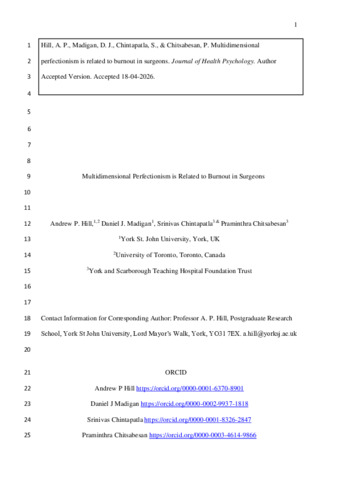 Accounts of work-related pressure by surgeons suggest a link between burnout – an 52 unhealthy occupational phenomenon – and perfectionism – the perceived or actual need to be 53 perfect. Adopting a stress-based theoretical framework, the present study assesses the degree 54 to which different dimensions of perfectionism are related to surgeon burnout. Using a cross-55 sectional design, 298 registered surgeons in the UK completed an online survey that included 56 the brief Multidimensional Perfectionism Scale (Cox et al., 2002) and the Maslach Burnout 57 Inventory (Maslach et al., 2016). Analyses showed that, when surgeons expected themselves 58 to be perfect, they reported higher exhaustion and, when they reported that others expected 59 them to be perfect, they reported higher levels of all three elements of burnout. Perceptions 60 that others expected them to be perfect was the most important predictor of each element of 61 burnout. Reducing these perceptions via targeted intervention, improved training, and 62 workplace changes may help prevent surgeon burnout.