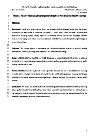 Hodgson, Philip, Haywood, Jack and Benham, Alex (2024) Physical activity following discharge from inpatient adult mental health settings. Mental Health and Physical Activity, 26 (100574).