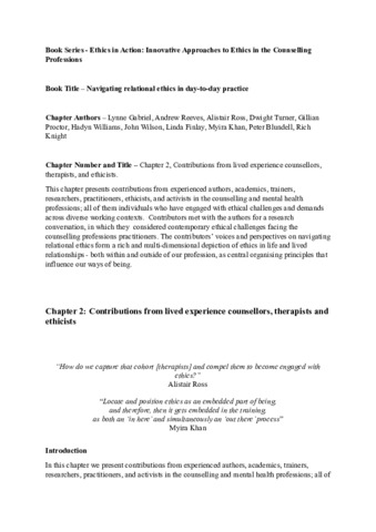 This chapter presents contributions from experienced authors, academics, trainers, researchers, practitioners, ethicists, and activists in the counselling and mental health professions; all of them individuals who have engaged with ethical challenges and demands across diverse working contexts. Contributors met with the authors for a research conversation, in which they considered contemporary ethical challenges facing the counselling professions practitioners. The contributors’ voices and perspectives on navigating relational ethics form a rich and multi-dimensional depiction of ethics in life and lived relationships - both within and outside of our profession, as central organising principles that influence our ways of being.