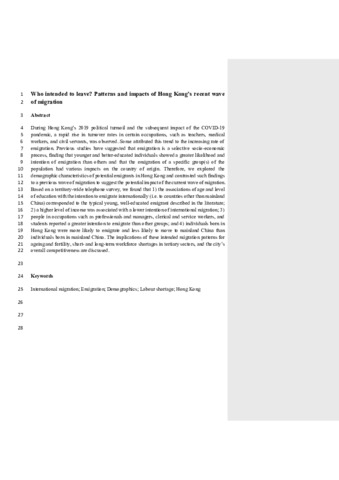 Who intended to leave? Patterns and impacts of Hong Kong's recent wave of migration.